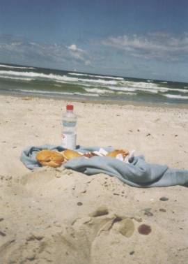 Wieder in Richtung Fähre beschließe ich einsamer Wolf nach Hause zu fahren, zurück nach Hamburg. Was der anhaltende Wolkenbruch allerdings verhindert. Blitz und Donner. Vier Stunden Aufenthalt unter einem großen, roten Klappschirm eines bekannten fast-food-Restaurants. Und das für Einen, der gestern noch glaubte, 'unendliche Weiten, die noch nie ein Mensch zuvor gesehen hat' zu finden! Was für eine Pleite. Als Spatzen sich über die von mir zur Verfügung gestellten Kuchenreste so sehr freuen, daß sie sich bis auf wenige Zentimeter an mich herantrauen, werte ich dies als positives Signal. Die kurze Hoffnung beendet ein weiterer Wolkenbruch.
