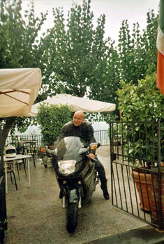 Die Strecke nach Norden zum Reisezug nach Verona beginne ich auf der SS71 und nehme in der wohl ungemütlichsten Bar der Toskana (so ne üble Trucker-Bude...) ein kräftiges zweites Frühstück und beschliesse, obwohl immer noch ziemlich verkatert, doch wieder auf gelbgrüne Strassen auszuweichen. Zweihundertfünfzig Kilometer mit 30km/h bis maximal 70 km/h in acht Stunden ununterbrochener Fahrt mit mehr Kurven als ansonsten in einem ganzen Jahr. Bibbiena, Borgo San Lorenzo, Firenzuola, Grüngelbes ohne Ende... Ich kann keine Kurven mehr sehen, denke ich. Meine Beine zittern, ich bin völlig erledigt. Das ‚La Torre di Jano' in Sasso Marconi bei Bologna suchend, kriege ich erstmal einen Kulturschock: Ein richtiger Touristenort im Apennin. Die Abgeschiedenheit und Ruhe aus Umbrien ist vergessen. "...gleich am Anfang des Ortes eine steile Auffahrt..." ist die Wegbeschreibung von Toskana-Karl. Uuuups, das ist aber sehr steil! Naja, da muss ich wohl durch: Ein Herz gefasst und den fast 300kg schweren Brocken trotz Stummellenkern mit Karacho wie eine Enduro durch die Kiesauffahrt raufgedroschen...bis nichts mehr vor, nichts mehr zurück, nichts mehr links oder rechts geht. Gut dass niemand zugesehen hat, wie ich mich da wieder rauswühlte.