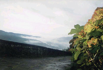 Am nächsten Morgen. Es hat geregnet. Alles ist nass. An diesem Ort der Stille schaue ich am frühen Morgen mit einer wärmenden Tasse Cappuccino in der Hand, in Jogginghose und Adiletten an den Füßen runter in das dampfende Tal. Die Frühsonne inszeniert heute ein Farbspiel wie weißleuchtende Watte. Immer mehr wird die dunkelgraublaue Wolkenfront gegen hellen Himmel getauscht. Der Hund setzt sich neben mich auf die Felsbrüstung und schaut mit mir ins Tal. Eine Nacht werde ich noch bleiben. Es ist zu schön hier.