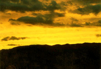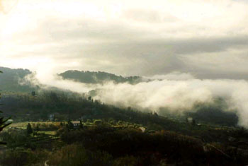 Und dann regnet es drei Tage wie aus Kübeln. Auf dem Weg nach Cortona unter schwarzen Wolken erlebe ich trotz pitschnasser Strasse zwischen Trestina bei Umbertide und Cortona eine Strecke, die, obwohl kaum über 1000 Meter hoch, zum Schönsten, Wahrsten und Besten gehört. In Cortona übernachte ich im Hotel ‚Oasi Neumann'. Und finde auf dem Parkplatz die gelbe BMW 1150 GS von Bernd aus Köln vom Autoreisezug. Jemand zum Reden! Mir fällt auf, daß ich seit Tagen nicht mehr gesprochen habe. Endlich! Hurra! Doch erst ins Hotel und die nassen Sachen auf die bereits eingeschalteten Heizungen gelegt. In der Toskana im September Heizung!